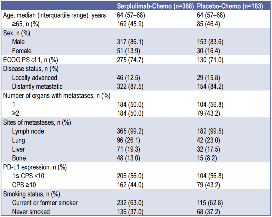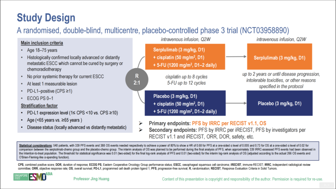 這是一項隨機、雙盲、多中心、安慰劑對照的III期臨床試驗(NCT03958890)。主要納入標準包括:①年齡為18~75歲,②經組織學確診的不可手術切除或通過放化療治癒的局部晚期/復發或遠處轉移的ESCC,③未接受過針對本次腫瘤的系統性治療,④至少有一個可測量的病灶,⑤PD-L1陽性(CPS≥1),⑥ECOG評分為0或1。患者按照2:1的比例隨機分配至實驗組和對照組,兩組治療方案分別為斯魯利單抗或安慰劑(3