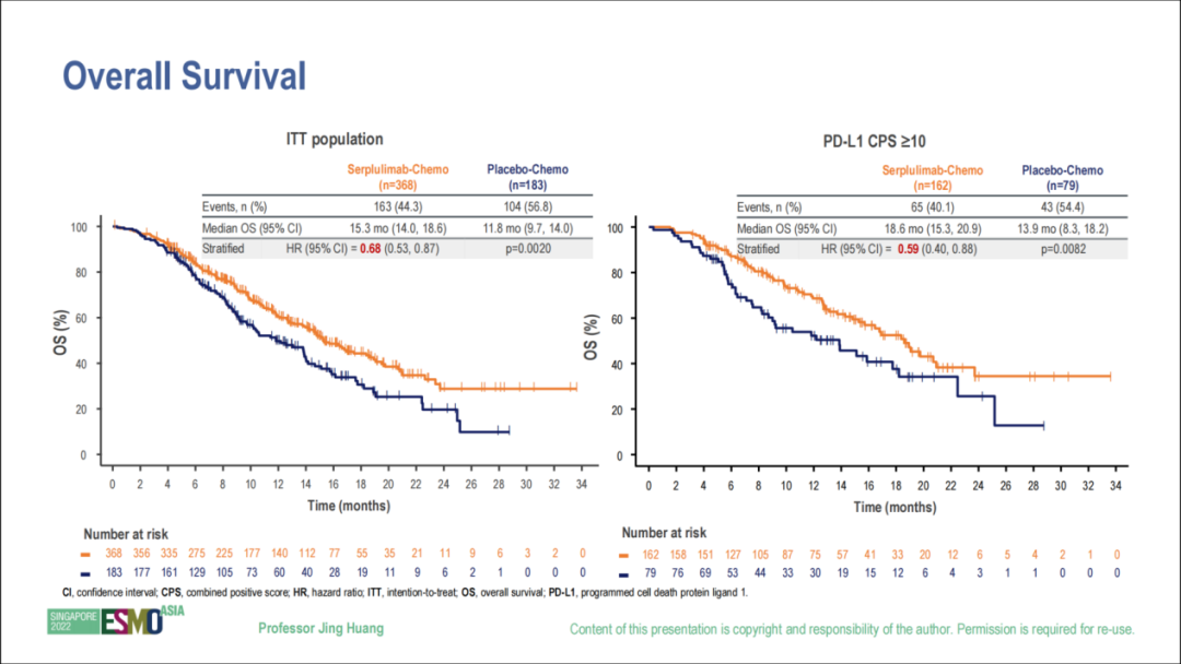 PI口頭報告了一項食管癌免疫治療的III期臨床研究——ASTRUM-007研究(摘要號:69O,報告時間:12月2日 16:55-17:05)。ASTRUM-007研究由全國70家中心共同參與開展,比較了斯魯利單抗或安慰劑聯合化療一線治療局部晚期/轉移性、PD-L1陽性(CPS≥1)食管鱗癌(ESCC)患者的療效和安全性,結果證明斯魯利單抗可帶來無進展生存期(PFS)、總生存期(OS)的顯著獲益,且CPS評分越高,獲益越大。