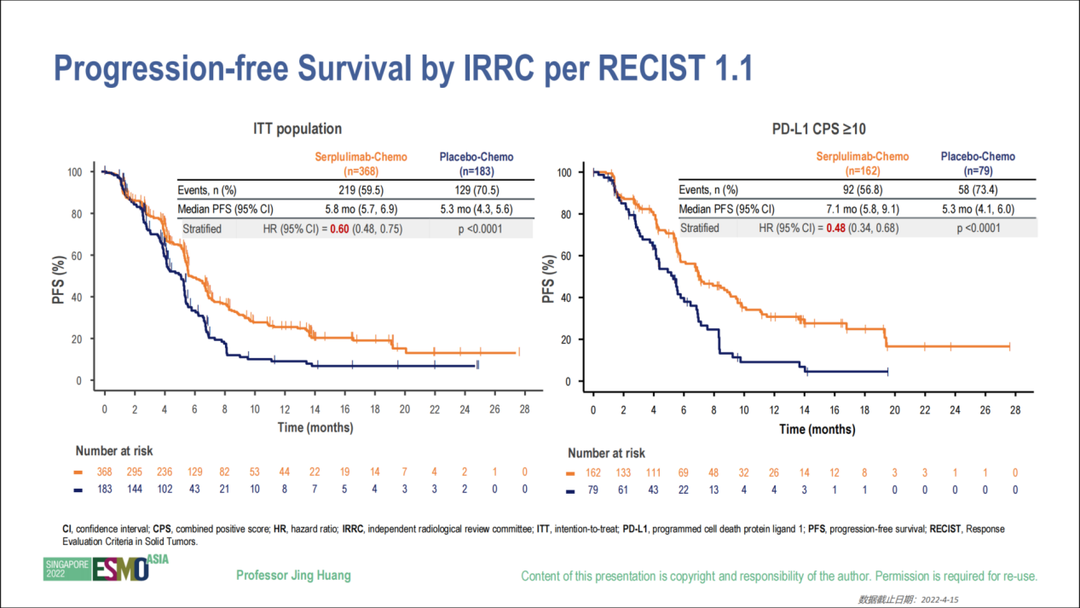主要終點方面,斯魯利單抗聯合化療組的中位PFS(由IRRC據RECIST v1.1評估)和中位OS均較安慰劑聯合化療組顯著延長,CPS≥10人群獲益更大。兩組總人群中位OS分別為15.3m vs 11.8m(HR=0.68,p=0.0020),死亡風險降低32%;CPS≥10人群中位OS分別為18.6m vs 13.9m(HR=0.59,p=0.0082),死亡風險降低41%(見圖3)。兩組總人群中位PFS分別為5.8m vs 5.3m(HR=0.60,p<0.0001),疾病進展風險降低40%;CPS≥10人群中位PFS分別為7.1m vs 5.3m(HR=0.48,p<0.0001),疾病進展風險降低52%(見圖4)。