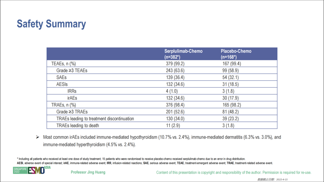 安全性方面,斯魯利單抗聯合化療組和安慰劑聯合化療組分別有243(63.6%)及99(58.9%)例患者發生≥3級治療相關不良事件(TRAEs),分別有11(2.9%)和3(1.8%)例患者發生了與治療相關的死亡。斯魯利單抗聯合化療組免疫相關不良事件(irAEs)發生率較安慰劑聯合化療組高(34.6% 和17.9%),與已獲批的PD-1/PD-L1抑制劑相似。最常見的irAEs包括免疫介導性甲狀腺功能減退、免疫介導性皮炎和免疫介導性甲狀腺功能亢進症。見圖6。