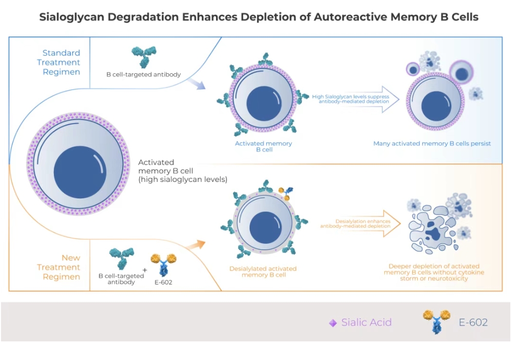 近年來,以利妥昔單抗(抗CD20單抗)等靶向抗體為代表的B細胞清除療法,已在全球多個市場獲批並被中華醫學會腎臟病學專家共識推薦用於治療腎小球腎炎[1]。然而,許多患者對這類藥物的治療反應並不理想。糖免疫提供了一種治療自身免疫疾病的新方法。該策略通過酶解唾液酸糖苷,打破致病性免疫細胞的「保護屏障」, 從而增強其清除效果,幫助恢復機體免疫平衡。