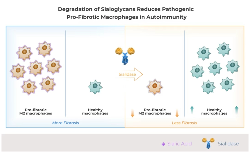 HLX79是基於Palleon的EAGLE糖編輯平台開發的潛在「同類首創」的人唾液酸酶融合蛋白。HLX79 通過酶解唾液酸糖苷,從而增強對兩類在自身免疫疾病中高度致病的免疫細胞的清除:一是驅動炎症的自身反應性記憶B細胞,二是促進纖維化和器官損傷的M2型巨噬細胞。