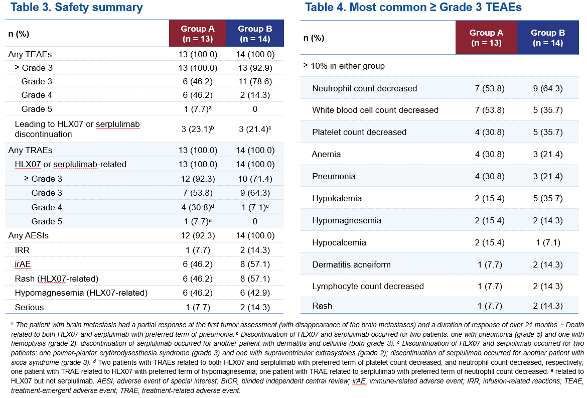 A組和B組中,獨立影像評估委員會(IRRC)根據RECIST 1.1評估的確認ORR分別為69.2%(95% 置信區間[CI] 38.6–90.9)和71.4%(95% CI 41.9–91.6),疾病控制率分別為92.3%(95% CI 64.0–99.8)和100%(95% CI 76.8–100.0)。