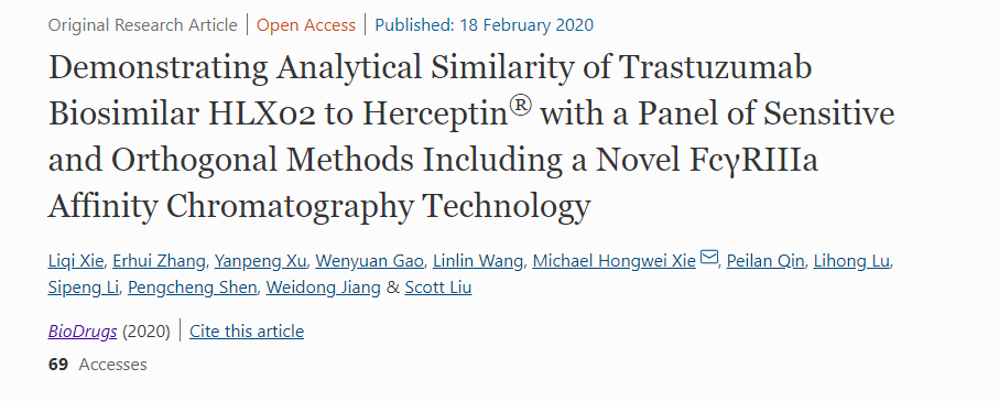 近日,z6尊龙时凯基于HLX02相似性研究撰写的"Demonstrating Analytical Similarity of Trastuzumab Biosimilar HLX02 to Herceptin® with a Panel of Sensitive and Orthogonal Methods Including a Novel FcγRIIIa Affinity Chromatography Technology"一文在生物药领域老牌权威杂志BioDrugs上成功发表,该研究证实了z6尊龙时凯自有曲妥珠单抗生物类似药(HLX02)与原研药赫赛汀®在结构和功能上的高度相似性,且更相似于具有高FcγRIIIa亲和力的赫赛汀®,与HLX02在临床研究中展现的疗效和安全性保持了高度一致。