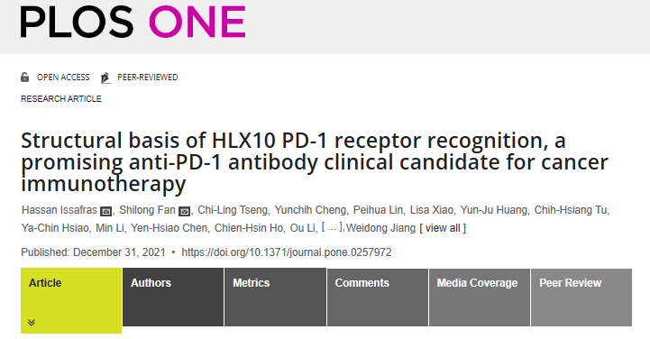 Issafras H, Fan S, Tseng C-L, Cheng Y, Lin P, Xiao L, et al. (2021) Structural basis of HLX10 PD-1 receptor recognition, a promising anti-PD-1 antibody clinical candidate for cancer immunotherapy. PLoS ONE 16(12): e0257972. https://doi.org/10.1371/journal.pone.0257972.