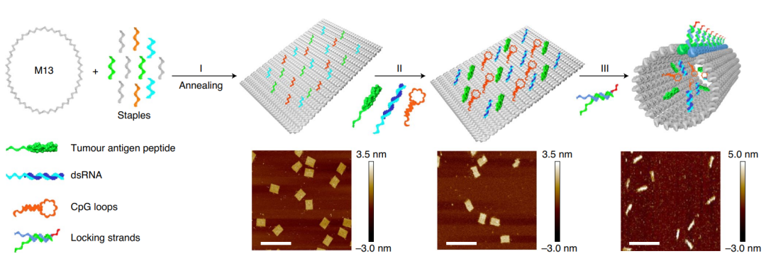 Schematic illustration of the construction of the tumour antigen peptide/CpG loop/dsRNA-co-loaded robotic nanostructure by DNA origami [7]