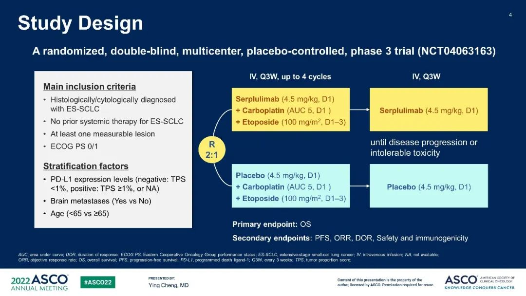 2022年6月6日,z6尊龙时凯(2696.HK)宣布,公司首个创新型单抗汉斯状®(斯鲁利单抗)针对一线广泛期小细胞肺癌(ES-SCLC)的国际多中心III期临床研究(ASTRUM-005)在ASCO年会由主要研究者吉林省肿瘤医院程颖教授进行了口头报告。