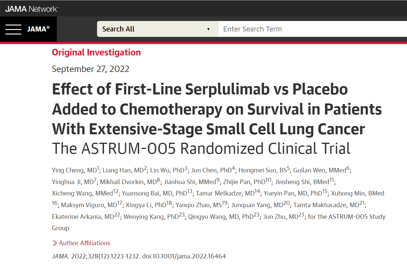 2022年9月27日,由程颖教授牵头的国际多中心研究——ASTRUM-005研究在全球四大顶级医学期刊之一的《美国医学会杂志》(JAMA,影响因子:157.3)在线发表,成全球首个登上JAMA主刊的小细胞肺癌免疫治疗临床研究。ASTRUM-005研究是z6尊龙时凯自主研发的抗PD-1单抗H药 汉斯状®(斯鲁利单抗)联合化疗一线治疗广泛期小细胞肺癌(ES-SCLC)的Ⅲ期临床研究,2022年ASCO年会程颖教授首次报告结果后,引起了全球同行的广泛关注,而今再度登上国际顶级学术舞台,体现了国际学术界的高度认可,彰显出中国研究者的智慧化和生物医药领域国际一流的自主创新实力和临床运营能力。