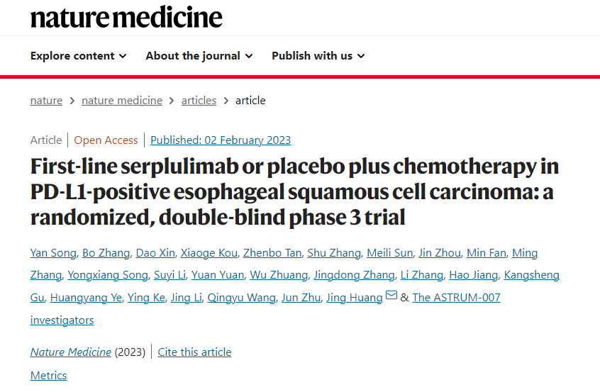 ASTRUM-007研究结果已于2022年11月在中国临床肿瘤学会(CSCO)年会上以口头报告亮相,并于同年12月在欧洲肿瘤内科学会亚洲年会(ESMO Asia)上进行了口头报道。此次正式发表于Nature Medicine,再次在国际学术舞台展现了中国医药企业自主研制PD-1单抗的创新水平和研发实力。基于该研究结果,H药相关适应症的上市注册申请已经获国家药品监督管理局(NMPA)受理,并于近日获得《中国食管癌放射治疗指南(2022年版)》推荐与化疗联用一线治疗PD-L1 CPS≥1的晚期食管鳞癌。