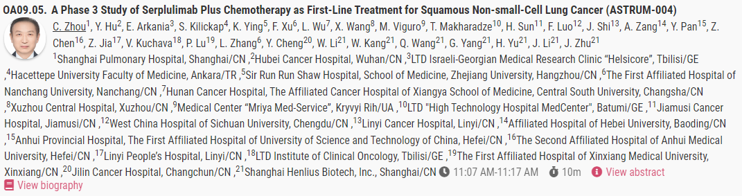 From September 9-12, 2023, the IASLC 2023 World Conference on Lung Cancer (“WCLC 2023”) hosted by the International Association for the Study of Lung Cancer will be held in Singapore. Results of the final analysis of efficacy, including progression-free survival (PFS) and overall survival (OS), and safety from the pivotal ASTRUM-004 study of HANSIZHUANG (serplulimab) plus chemotherapy as first-line treatment for previously untreated locally advanced or metastatic squamous non-small-cell lung cancer (sqNSCLC) will be orally presented by the leading principal investigator of ASTRUM-004, Professor Caicun Zhou from Shanghai Pulmonary Hospital.